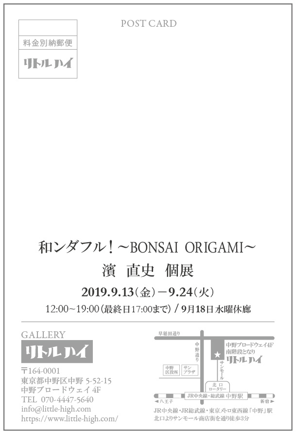 2019年9月13日(金)~9月24日(火) 12:00~19:00(最終日17:00まで) 9月18日水曜休廊 入場無料
